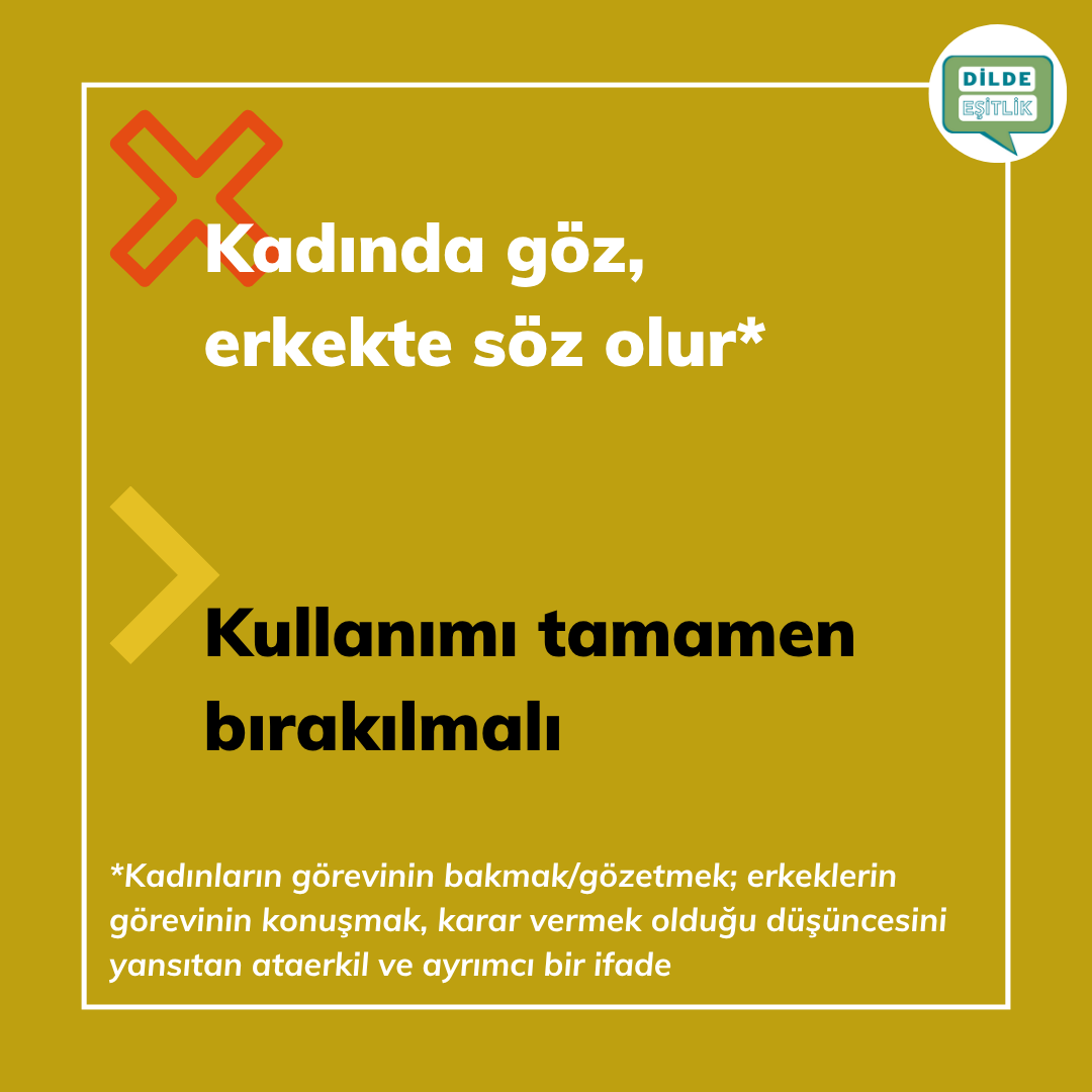 Kategoriler Cinsiyet Ayrımcılığı İçeren Atasözleri Kadında göz, erkekte söz olur Yazının yazarı Yazar Dilde Eşitlik Yazı tarihi 14.10.2020 Yorum yok Kadında göz, erkekte söz olur
