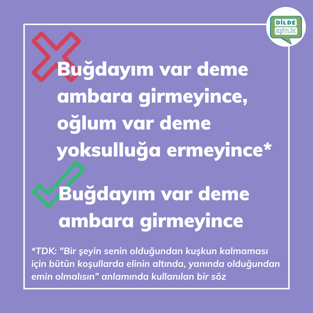Kategoriler Cinsiyet Ayrımcılığı İçeren Atasözleri Buğdayım var deme ambara girmeyince, oğlum var deme yoksulluğa ermeyince Yazının yazarı Yazar Dilde Eşitlik Yazı tarihi 21.10.2020 Yorum yok Buğdayım var deme ambara girmeyince, oğlum var deme yoksulluğa ermeyince