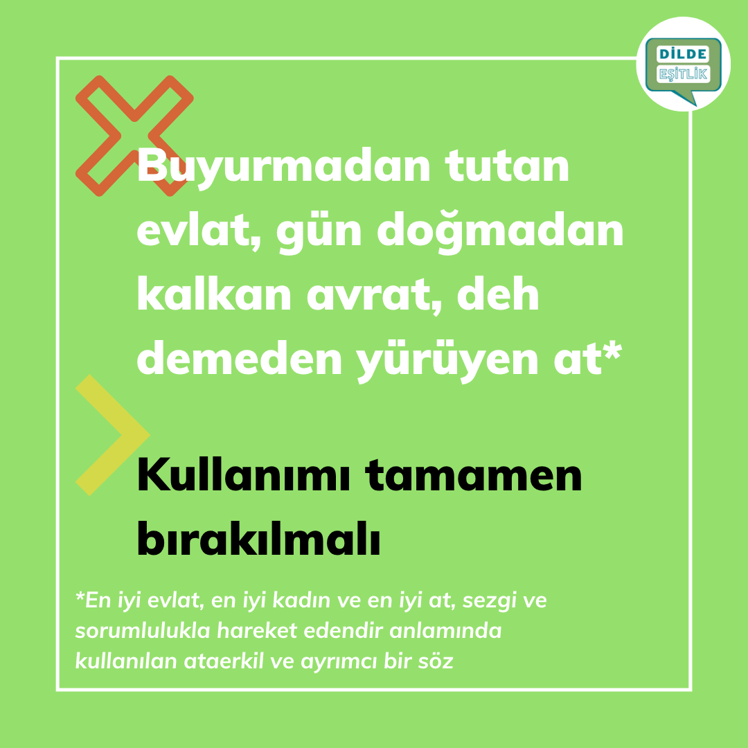 Kategoriler Cinsiyet Ayrımcılığı İçeren Atasözleri Buyurmadan tutan evlat, gün doğmadan kalkan avrat, deh demeden yürüyen at Yazının yazarı Yazar Dilde Eşitlik Yazı tarihi 21.10.2020 Yorum yok Buyurmadan tutan evlat, gün doğmadan kalkan avrat, deh demeden yürüyen at