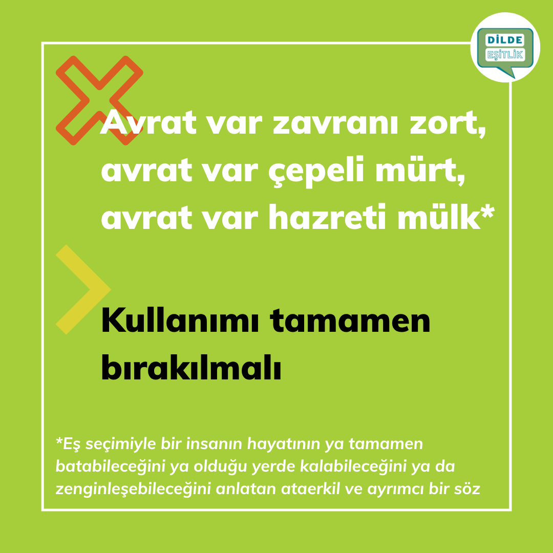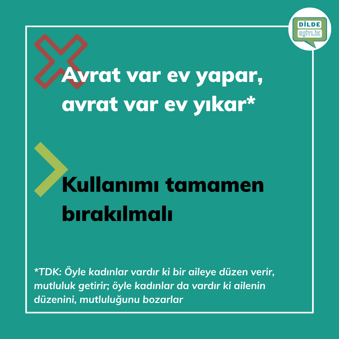 Kategoriler Cinsiyet Ayrımcılığı İçeren Atasözleri Avrat var ev yapar, avrat var ev yıkar Yazının yazarı Yazar Dilde Eşitlik Yazı tarihi 21.10.2020 Yorum yok Avrat var ev yapar, avrat var ev yıkar