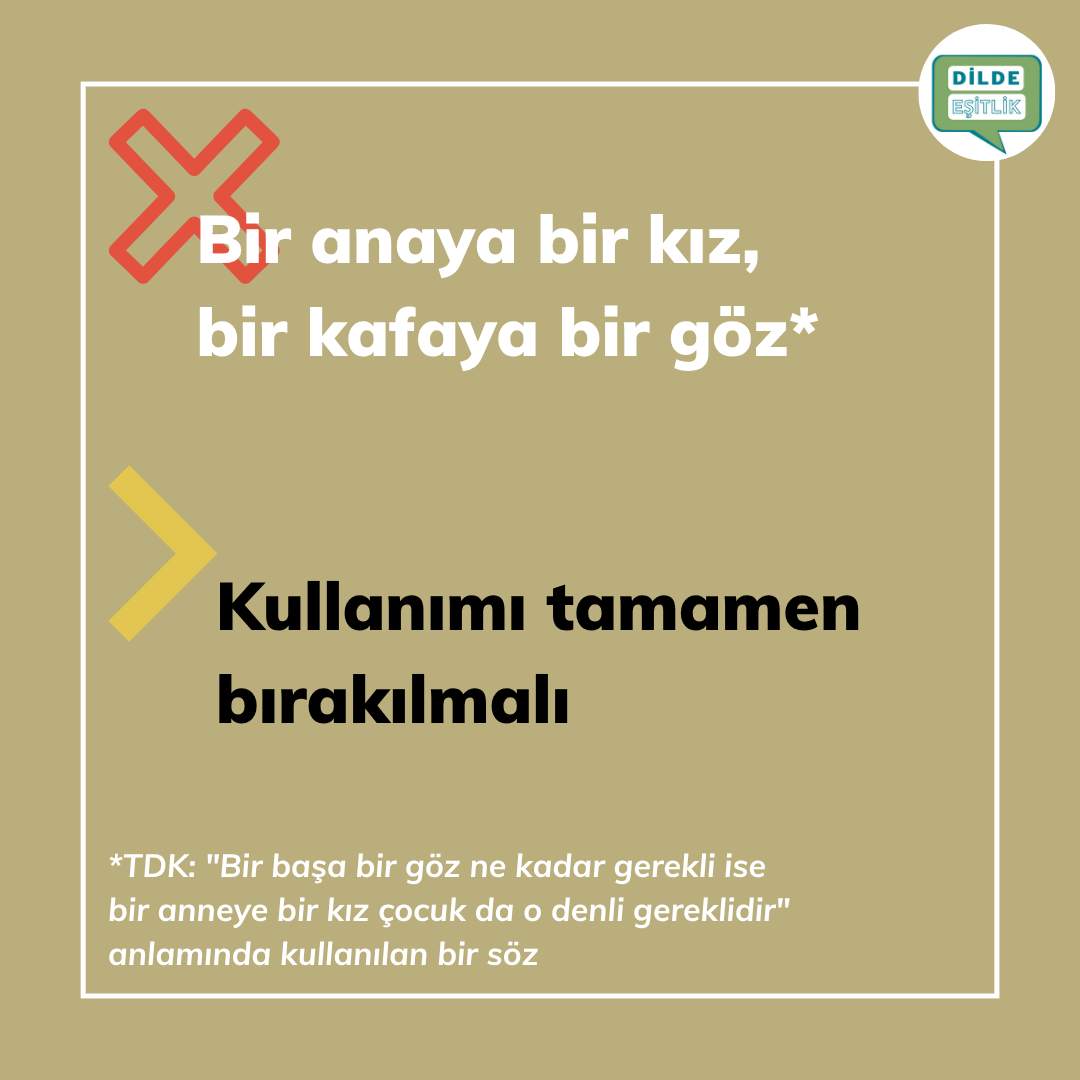Kategoriler Cinsiyet Ayrımcılığı İçeren Atasözleri Bir anaya bir kız, bir kafaya bir göz Yazının yazarı Yazar Dilde Eşitlik Yazı tarihi 21.10.2020 Yorum yok Bir anaya bir kız, bir kafaya bir göz