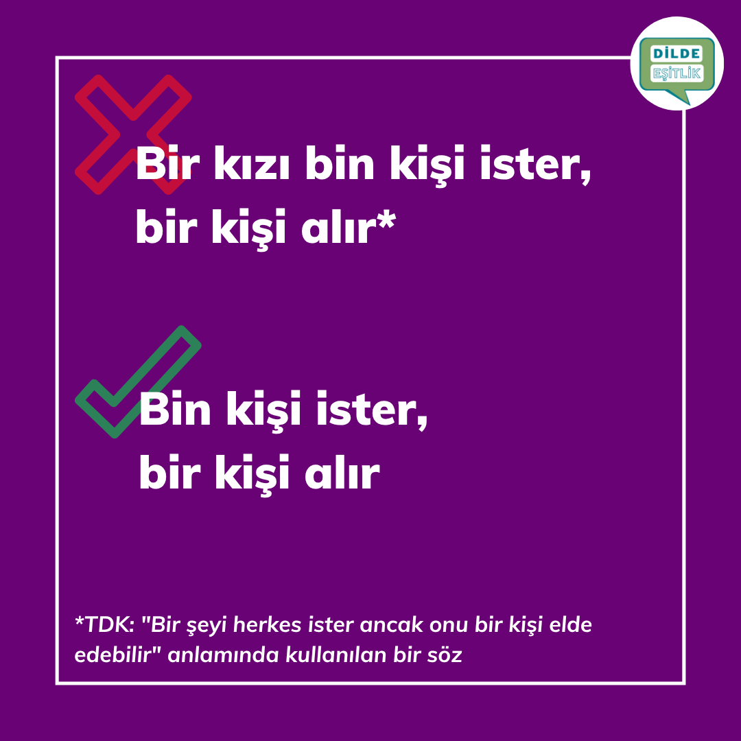 Kategoriler Cinsiyet Ayrımcılığı İçeren Atasözleri Bir kızı bin kişi ister, bir kişi alır Yazının yazarı Yazar Dilde Eşitlik Yazı tarihi 21.10.2020 Yorum yok Bir kızı bin kişi ister, bir kişi alır