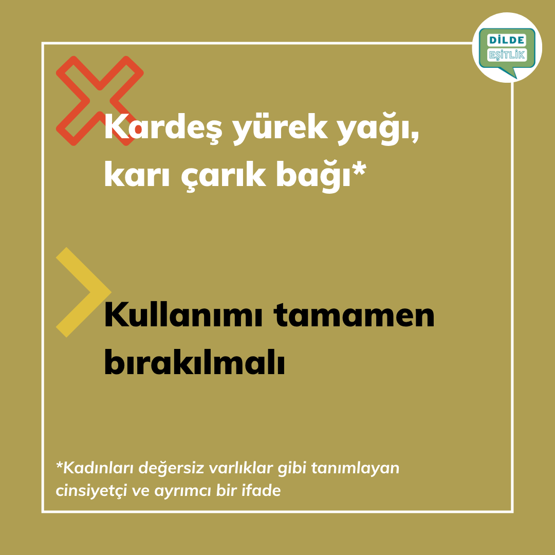 Kategoriler Cinsiyet Ayrımcılığı İçeren Atasözleri Kardeş yürek yağı, karı çarık bağı Yazının yazarı Yazar Dilde Eşitlik Yazı tarihi 14.10.2020 Yorum yok Kardeş yürek yağı, karı çarık bağı ← Kardeş mezarı yok, karı mezarı çok → Karı doğurduğu kızı beğenmez Bir yanıt yazın Yanıtı iptal etE-posta adresiniz yayınlanmayacak. Gerekli alanlar * ile işaretlenmişlerdirYorum * Ad E-posta İnternet sitesi Daha sonraki yorumlarımda kullanılması için adım, e-posta adresim ve site adresim bu tarayıcıya kaydedilsin. Type in the text displayed above Δ