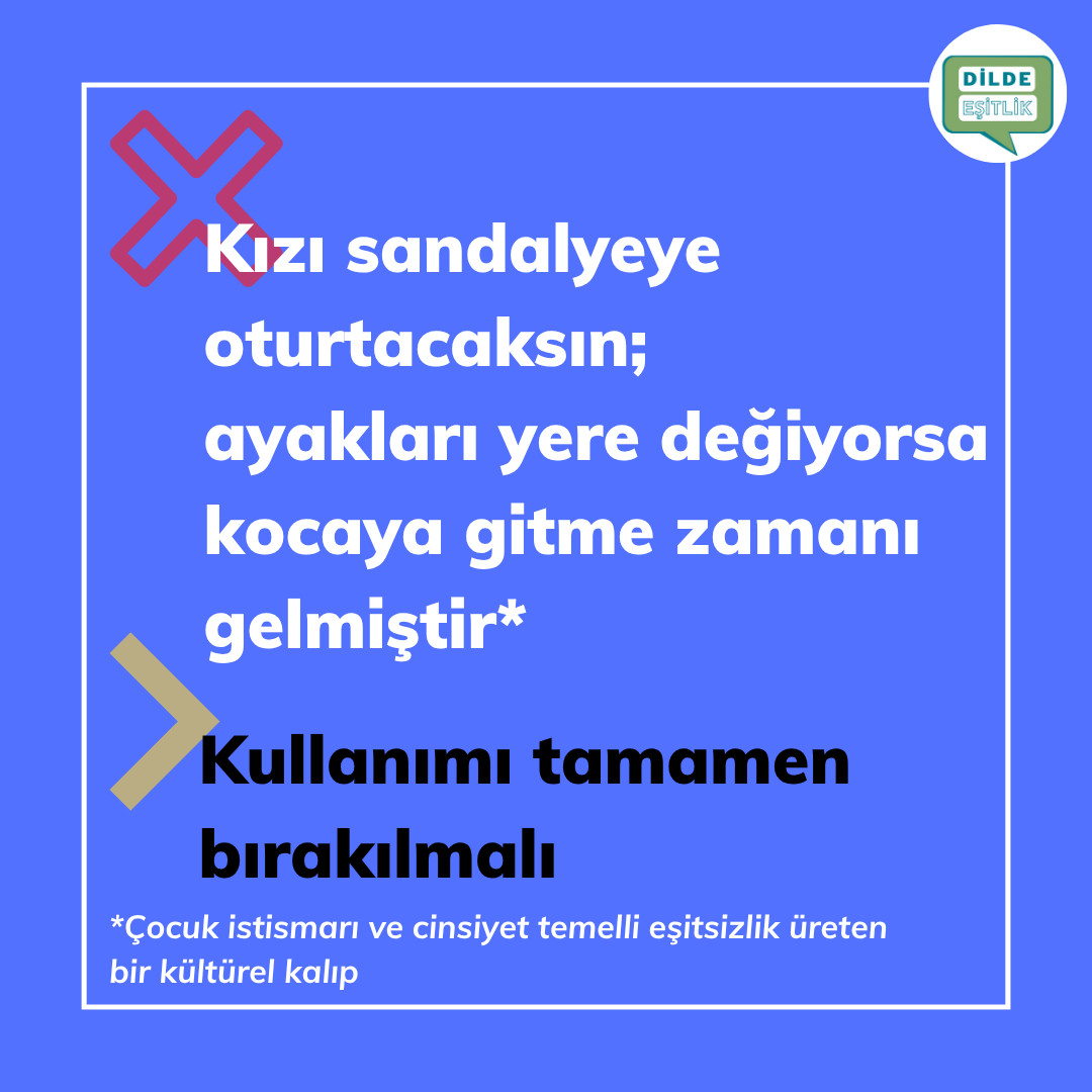 Kategoriler Cinsiyet Ayrımcılığı İçeren Atasözleri Kızı sandalyeye oturtacaksın; ayakları yere değiyorsa kocaya gitme zamanı gelmiştir Yazının yazarı Yazar Dilde Eşitlik Yazı tarihi 14.10.2020 Yorum yok Kızı sandalyeye oturtacaksın; ayakları yere değiyorsa kocaya gitme zamanı gelmiştir ← Kızı gönlüne bırakırsan ya davulcuya varır ya zurnacıya → Kızlar evlenmeyi bir şey sanmış; vardığı günden usanmış Bir yanıt yazın Yanıtı iptal etE-posta adresiniz yayınlanmayacak. Gerekli alanlar * ile işaretlenmişlerdirYorum * Ad E-posta İnternet sitesi Daha sonraki yorumlarımda kullanılması için adım, e-posta adresim ve site adresim bu tarayıcıya kaydedilsin. Type in the text displayed above Δ