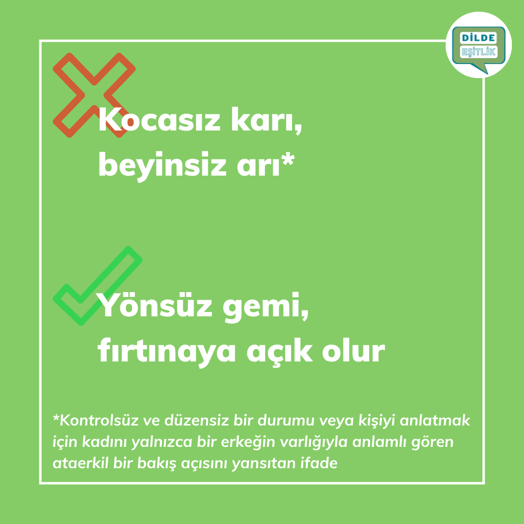 Kategoriler Cinsiyet Ayrımcılığı İçeren Atasözleri Kocasız karı, beyinsiz arı Yazının yazarı Yazar Dilde Eşitlik Yazı tarihi 14.10.2020 Yorum yok Kocasız karı, beyinsiz arı ← Kızlar evlenmeyi bir şey sanmış; vardığı günden usanmış → Kürt buldu, tanışı kaldı Bir yanıt yazın Yanıtı iptal etE-posta adresiniz yayınlanmayacak. Gerekli alanlar * ile işaretlenmişlerdirYorum * Ad E-posta İnternet sitesi Daha sonraki yorumlarımda kullanılması için adım, e-posta adresim ve site adresim bu tarayıcıya kaydedilsin. Type in the text displayed above Δ